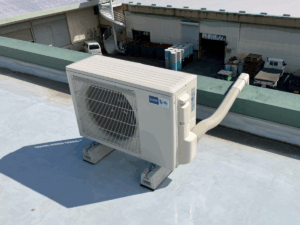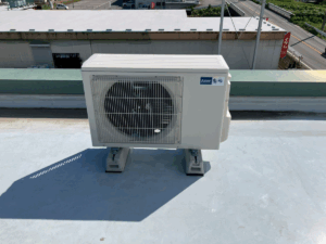 エアコン室外機の取付時、配管ルートが貫通部から上方向に立ち上がる形状となっていたため、雨水や結露水が建物内部へ浸入するリスクがありました。これを防ぐため、貫通部に止水処理を施し、防水性を確保しました。